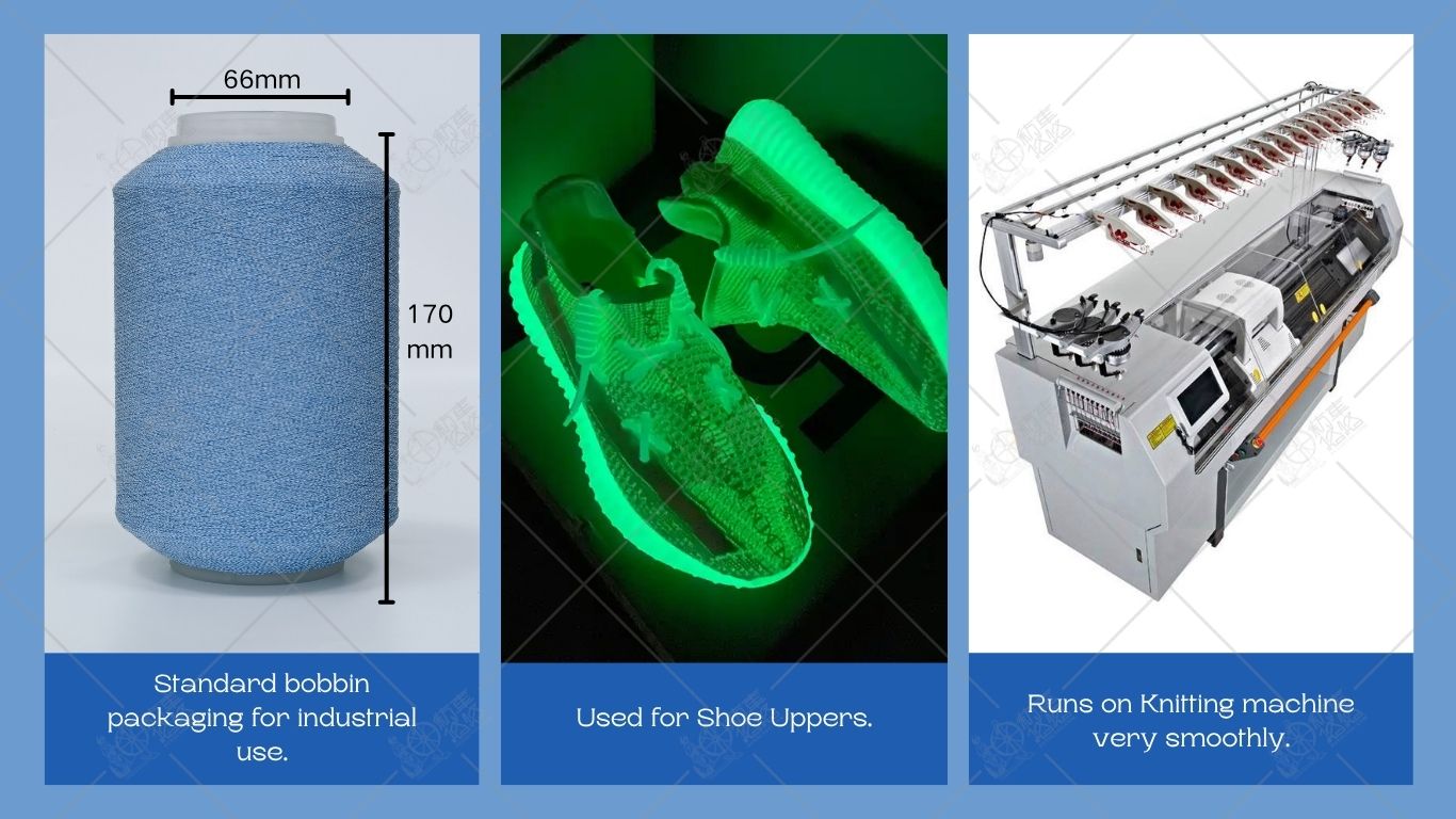 High light glow in the dark Flyknitting Yarn is Designed for shoe uppers, this yarn charges under light and glows brightly in the dark, adding both function and fashion.