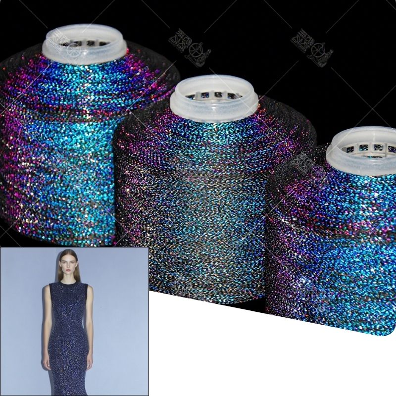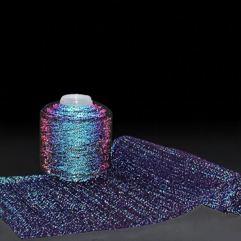 Dongguan Velve Thread Manufactury presents Rainbow Diamond Reflective Yarn, a stunning combination of vibrant colors and high visibility. Perfect for adding sparkle and safety to your creations, whether it's apparel, accessories, or outdoor gear. Reflective properties that change color at different angles. Blue in the center, with purple hues on the sides.